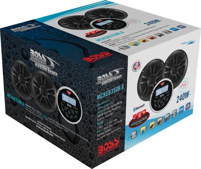 De Boss Marine MCKGB350B.6 is een complete radioset bestaande uit de MGR350B radio, twee zwarte MR6B speakers en een MRANT10 antenne. Stream al uw muziek via de MP3- of USB poort of Bluetooth verbinding met uw smartphone of andere mobiele apparaten. Zo kunt u aan boord op uw boot al uw persoonlijke muziek beluisteren! Door de Bluetooth verbinding kunt u de Boss Marine MGR350B gemakkelijk bedienen op afstand via uw smartphone. Zo heeft u altijd al uw favoriete muziek bij de hand en kunt u moeiteloos wisselen van playlist, ook als u niet bij de radio staat. De Boss Marine MGR350B radio heeft een mooi rond design. De Boss Radio MCKGB350B.6 set is zeer geschikt voor kleinere boten. U kunt de ronde radio van Boss inbouwen in uw dashboard.